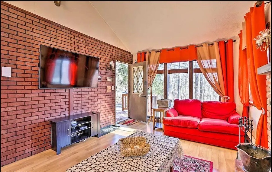 It departs from the norm in the Poconos in that it has a split-level main living area.