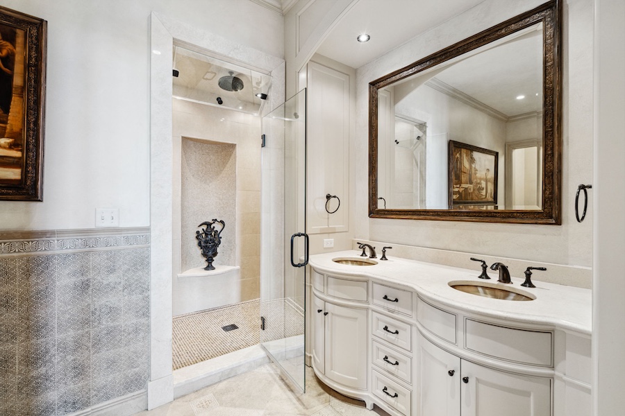 Its limestone-faced bathroom boasts dual vanities, a frameless glass shower and a whirlpool soaking tub.